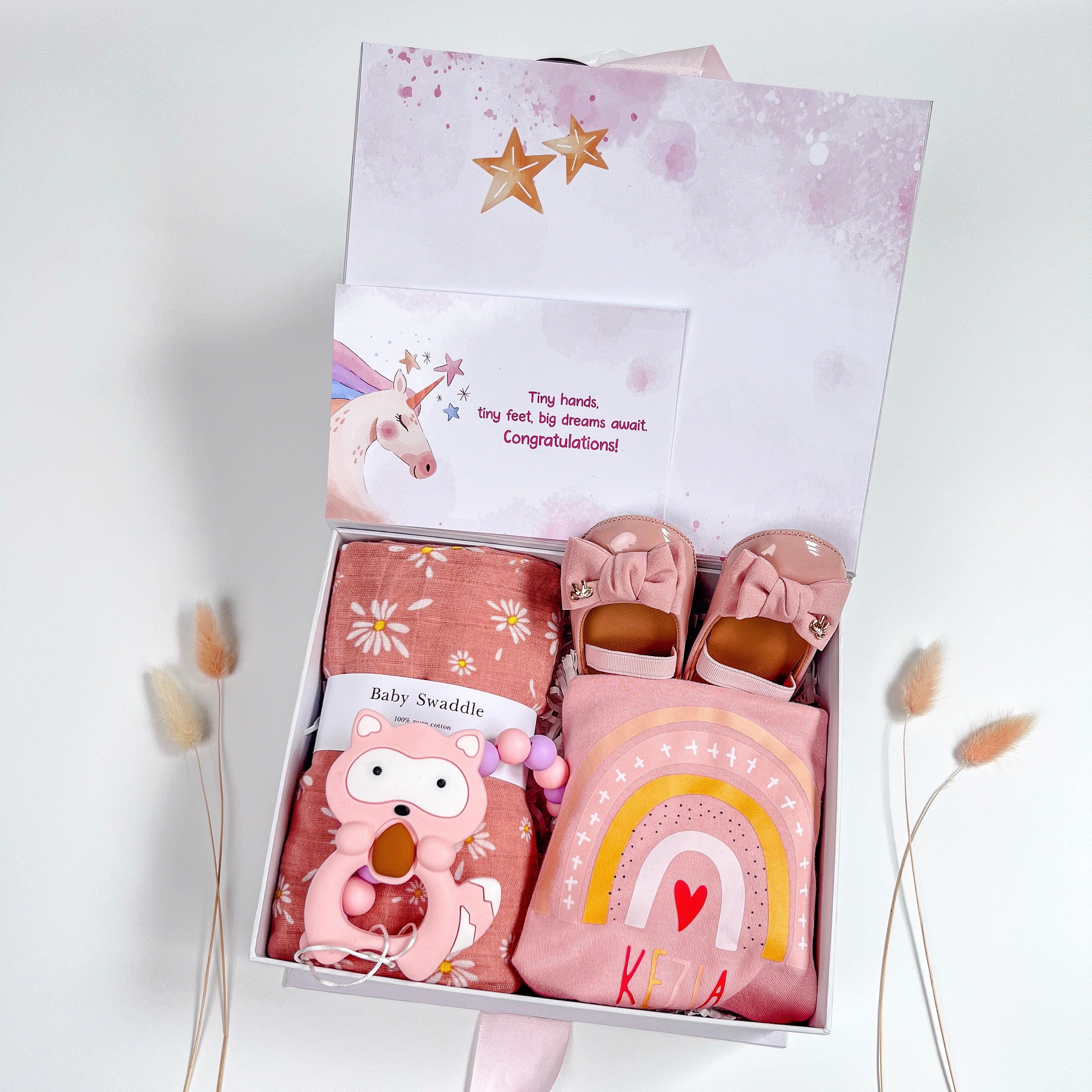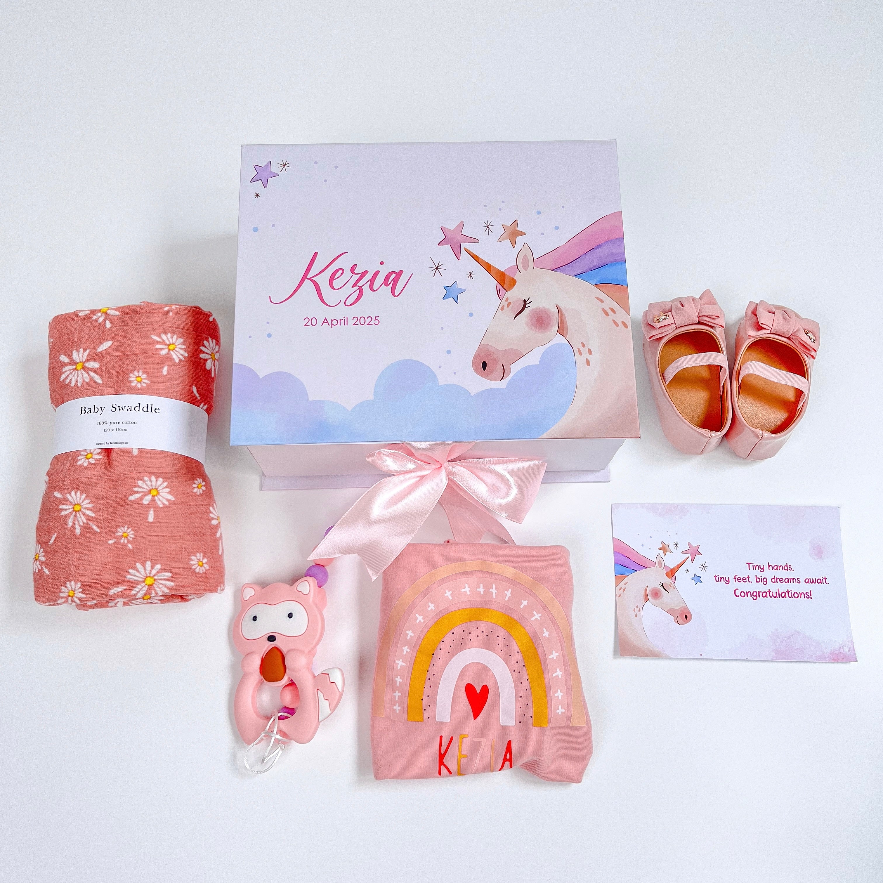 A delightful bundle of soft and practical baby essentials, lovingly curated to welcome a little one. Perfect for baby showers, christenings, or newborn gifts.