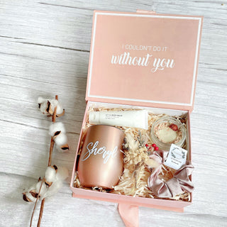 Our curated gift boxes carry two sizing. The standard boxes are approximately 22 x 18 x 9 cm, and the petite boxes are approximately 15 x 12 x 7 cm. We will pack your gift into the most appropriate size of box based on packages you selected.